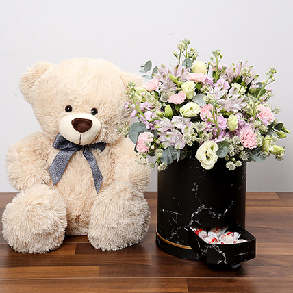 Online Pink And White Floral Box With Chocolates And Teddy Gift Delivery In Singapore Fnp